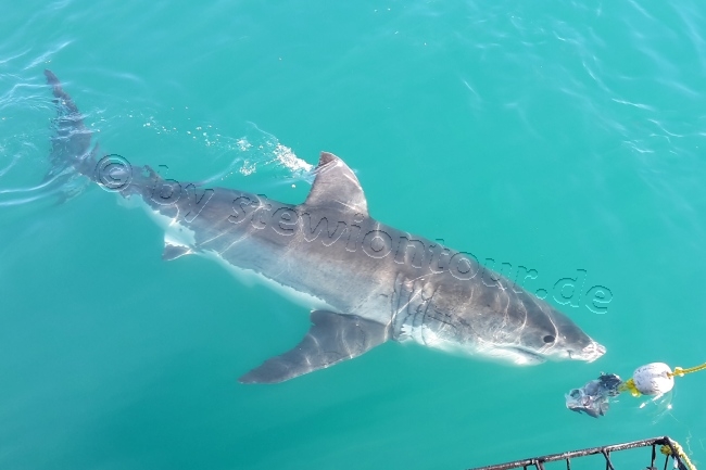 Nach einem Sicherheitsbriefing gehen wir mit Neoprenanzügen ausgestattet an Bord und mit einer ca. 15 min Bootsfahrt ankern wir direkt vor Dyler Island. Schon während der Käfig mit den Fischködern am Boot wieder befestigt wird bekommen wir den ersten Besuch von zwei Haien.